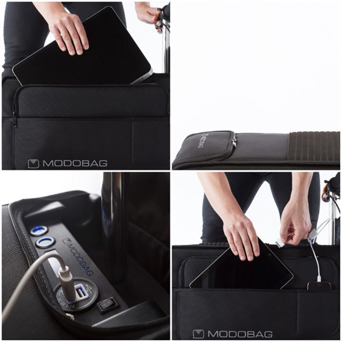 Bên cạnh chức năng "lái vali vòng vòng", Modobag còn có một số tính năng hữu dụng khác như được tích hợp pin dự phòng với hai cổng USB, có ngăn đựng smartphone/tablet giúp lấy ra bỏ vào nhanh. Modobag có kết nối với app chuyên biệt trên smartphone để giúp chủ nhân có thể theo dõi vali của mình theo thời gian thực qua GPRS-GSM, hoặc cảnh báo xa gần để chống mất trộm.