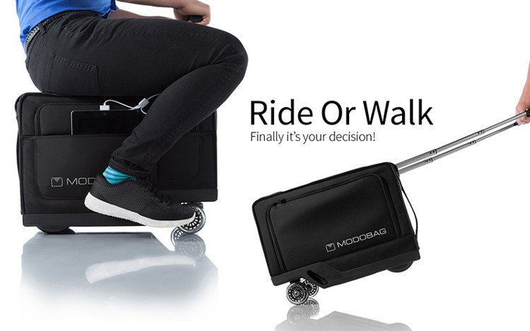 Kéo vali cồng kềnh và đi bộ một quãng dài ở sân bay là điều không phải ai cũng thấy dễ chịu, chính vì thế hãng Modobag LLC (Mỹ) đã sáng chế ra chiếc vali cùng tên có thể giúp cho người sử dụng ngồi lên và lái đi như xe điện.