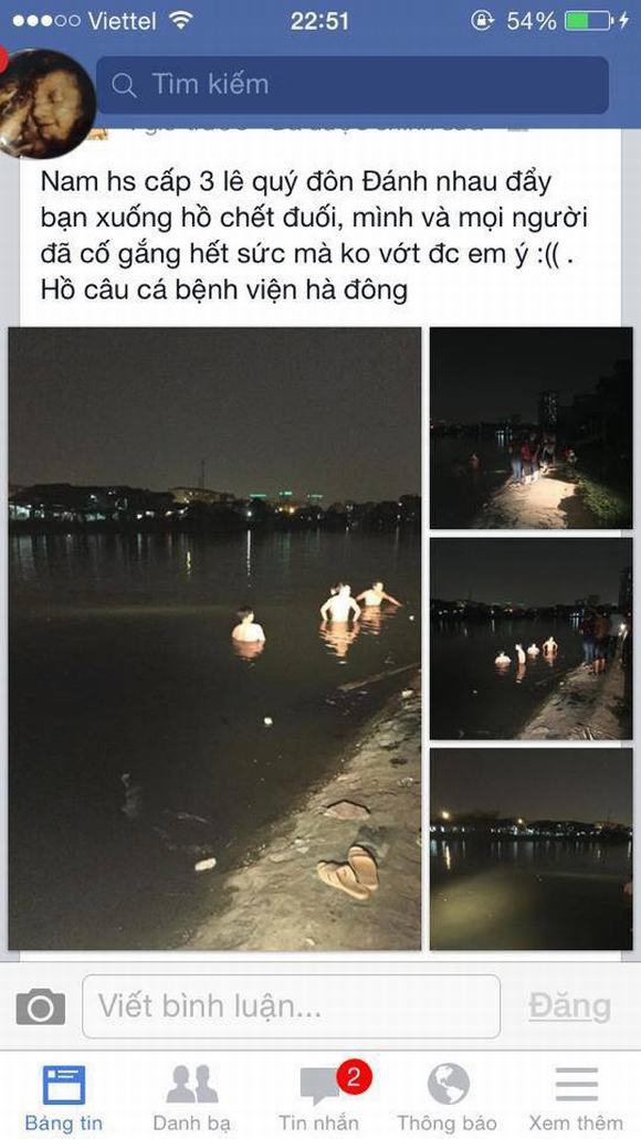 Mới đây trên các diễn đàn và trang mạng xã hội xôn xao tin đồn nam sinh đẩy bạn xuống hồ, ném đá cho chết rồi lên face tự thú. Thông tin này nhanh chóng được dân mạng chia sẻ với tốc độ chóng mặt. Theo thông tin được chia sẻ trên mạng, vào khoảng 18h ngày 6/10, tại khu vực ao cá gần Bệnh viện đa khoa Hà Đông (phường Quang Trung, Hà Đông, Hà Nội) đã xảy ra 1 vụ án mạng thương tâm khiến một nam thanh niên tử vong. Bước đầu nạn nhân được xác định tên là Mạnh (SN 1996, trú tại phường Vạn Phúc, quận Hà Đông, Hà Nội).