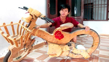 Đức cho biết: “Các ổ bi phía dưới sẽ nâng đỡ giàn chiếc xe, chúng ăn khớp với các bánh răng và dây xích”. Còn lại các bộ phận như giỏ xe, bàn đạp đều làm bằng ván. Thời gian thực hiện trong một tháng, chi phí 7 triệu đồng. Đức cho biết: “Em cho các bạn chạy thử và đã bán được một số sản phẩm. Rất nhiều người thích thú vì sự độc đáo của nó”.
