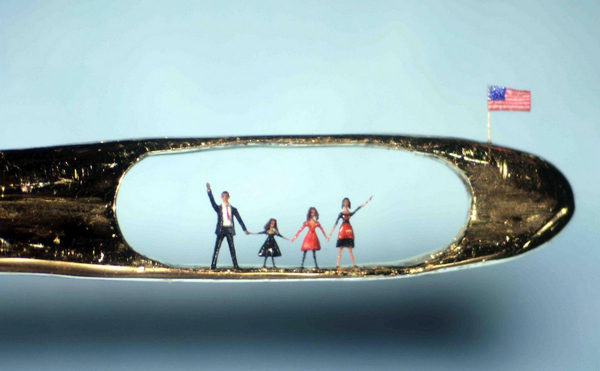Sử dụng phần đầu kim dùng để xâu chỉ làm phần nền để điêu khắc, Willard Wigan là người mở đường cho nghệ thuật “điêu khắc siêu vi”. Trong hình là bức điêu khắc về gia đình tổng thống Obama (Mỹ).