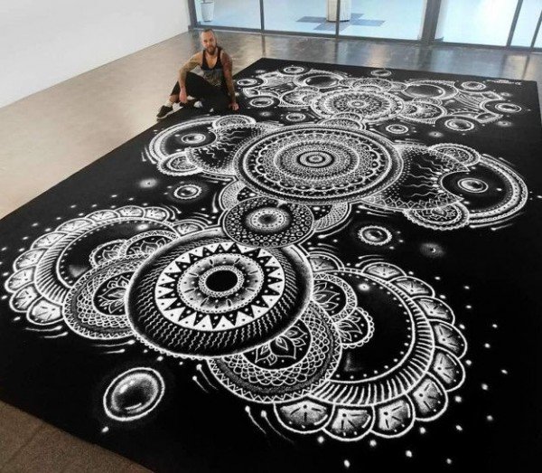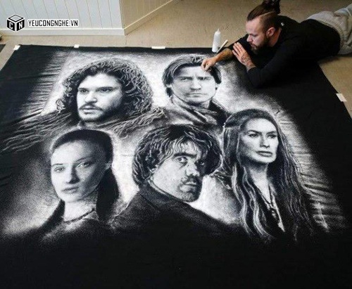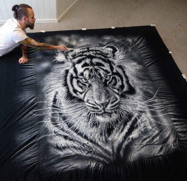 Để vẽ tranh bằng muối, Dino Tomic đã trải ra sàn một tấm vải đen làm nền rồi tỉ mỉ sắp xếp những hạt muối nhỏ li ti theo đúng kiểu anh muốn cho đến khi bức tranh hoành tráng hoàn thiện.
