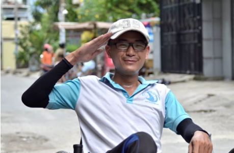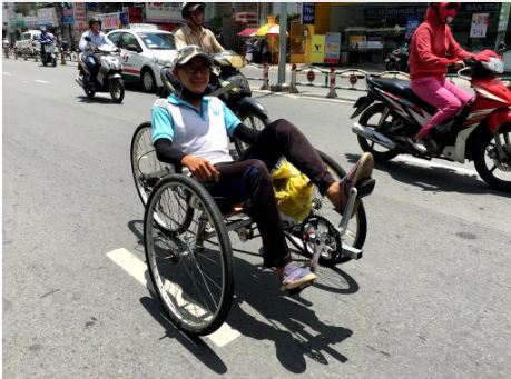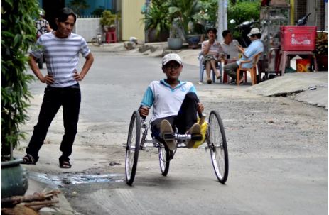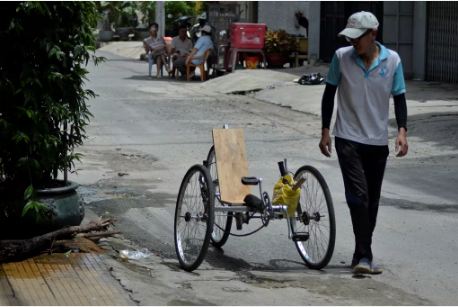 Hình ảnh anh Tuấn di chuyển bằng xe đạp nằm làm cho nhiều người tò mò.