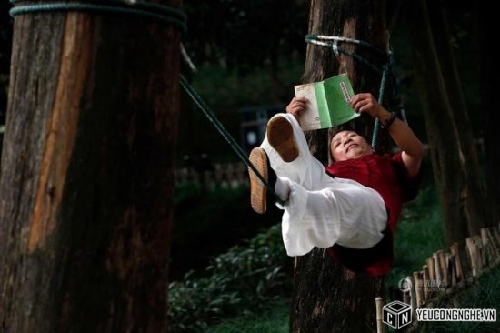Ông nằm đọc sách trên dây.