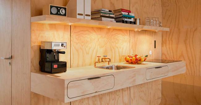 Các cửa số có thể được thêm vào bất cứ khi nào chủ nhà muốn. Những phần nội thất như nhà bếp, nhà tắm có thể được lắp thêm vào qua các khối riêng. Bên trong nhà được phủ một lớp ván ép mang lại sự đơn giản và gần gũi với thiên nhiên.