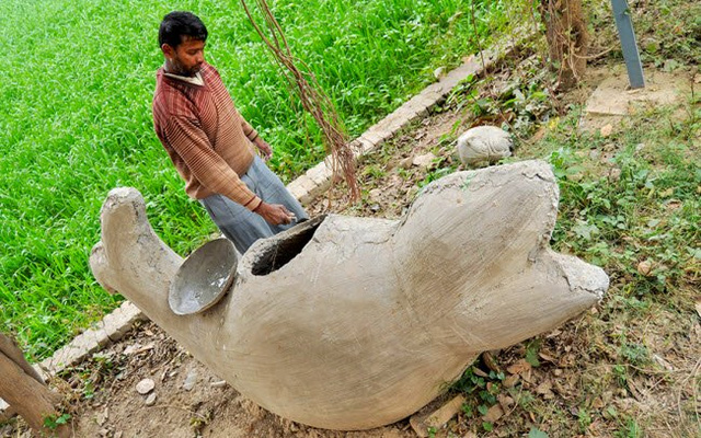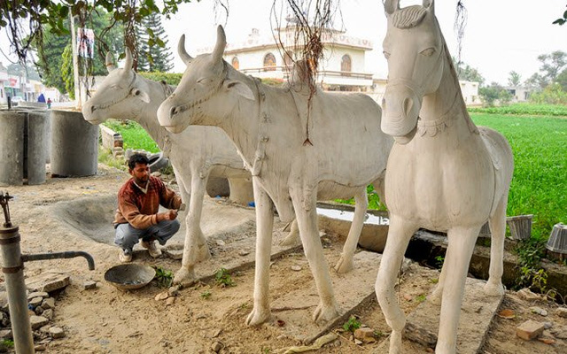 Một nghệ nhân đang hoàn thiện các bể nước hình bò và ngựa.