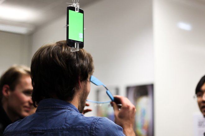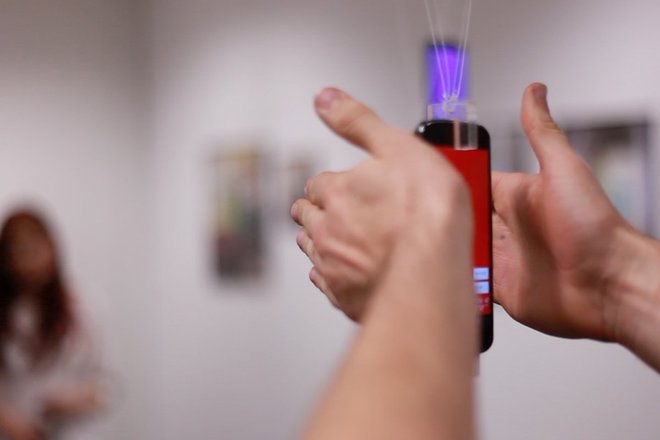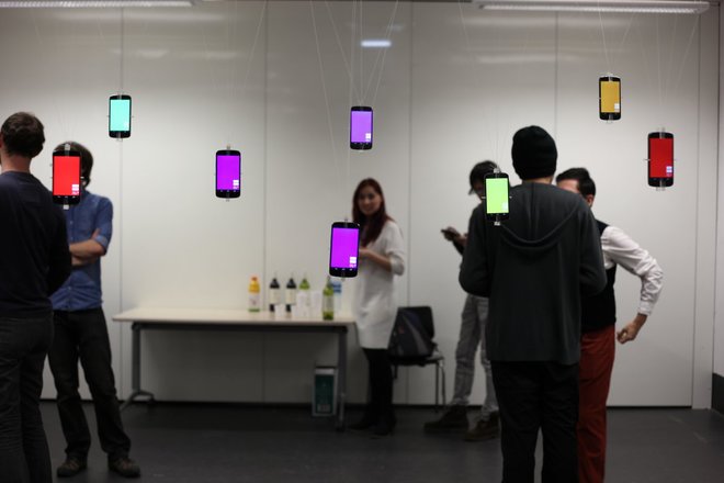 Trong một cuộc triển lãm, Hernan treo các smartphone đã cài sẵn ứng dụng đo sóng.