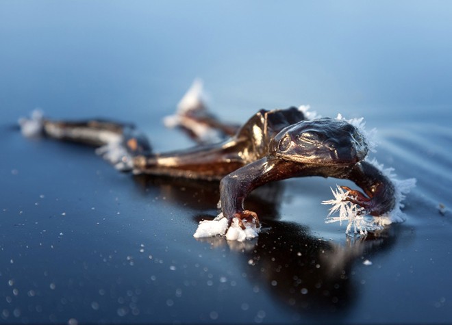 | Con ếch băng đã chết và bị đóng băng trên hồ nước ở Bindingsvannet, Na Uy. Ảnh: National Geographic |