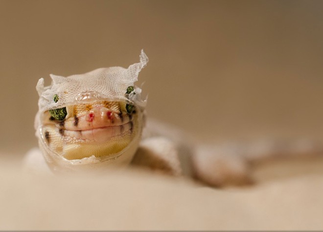 | Con thằn lằn có tên khoa học Teratoscincus roborowskii đang lột da ở Terrarium, Ulm, Đức. Ảnh: National Geographic |