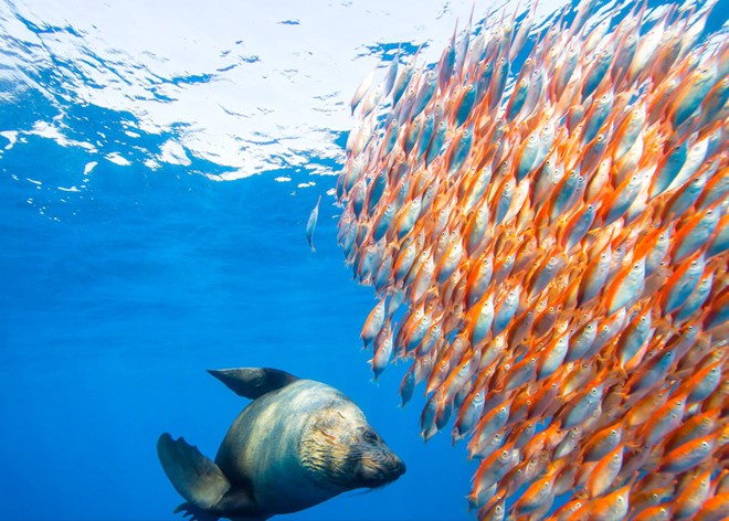 | Con hải cẩu săn đàn cá màu cam sặc sỡ ở Sydney Australia. Ảnh: National Geographic |