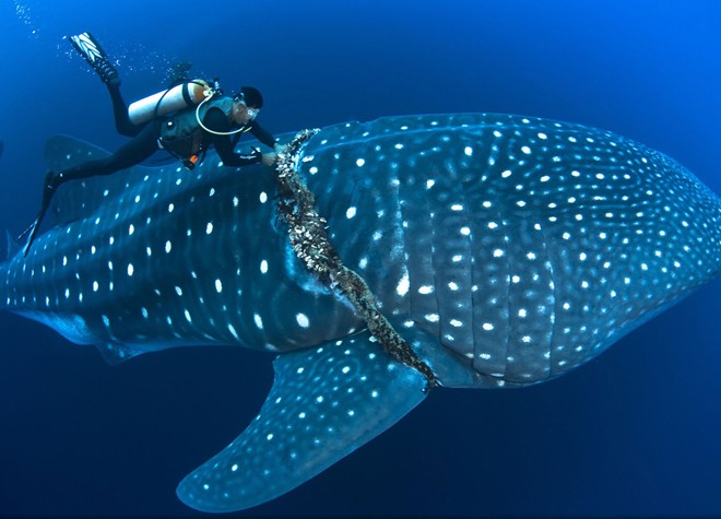 | Người thợ lặn cố lấy một vật thể lạ quấn quanh con cá mập voi ở ngoài khơi Roca Partida, Mexico. Ảnh: National Geographic |