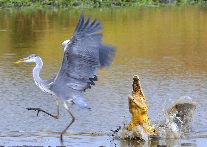 | Cá sấu sông Nile đớp hụt con diệc xám ở Masai Mara NP, Kenya. Ảnh: National Geographic |