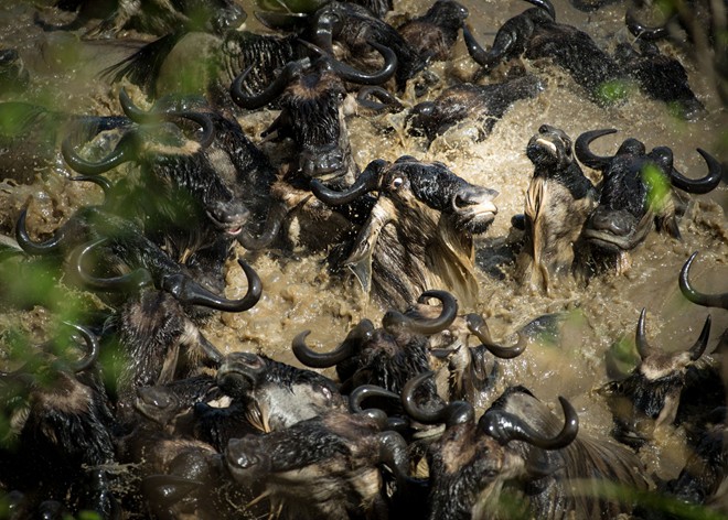 | Những con linh dương đầu bò chen nhau khi qua sông ở Masai Mara, Kenya, châu Phi. Ảnh: National Geographic |