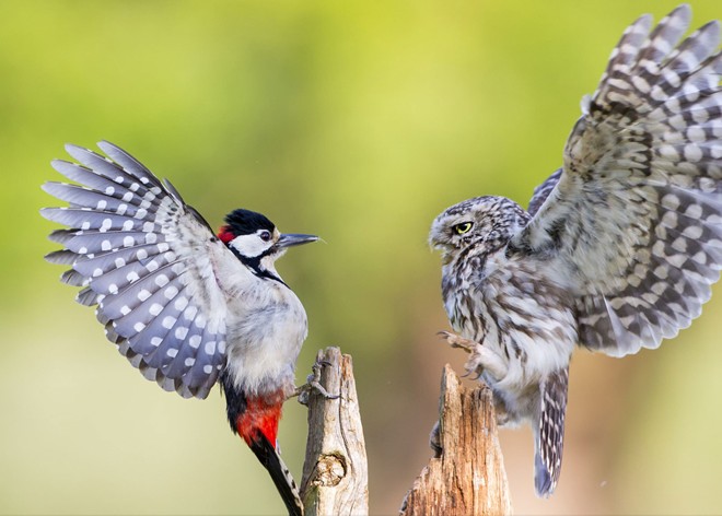 | Con chim cú nhỏ (phải) bảo vệ lãnh thổ trước sự xâm lấn của con chim gõ kiến (trái) tại một khu rừng ở Droitwich, Anh. Ảnh: National Geographic |