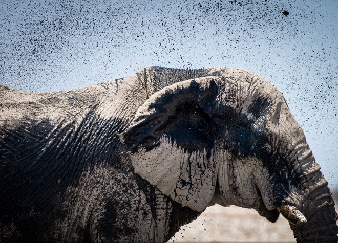 | Con voi vẩy nước trên cơ thể ở Công viên Quốc gia Etosha, Namibia. Ảnh: National Geographic |