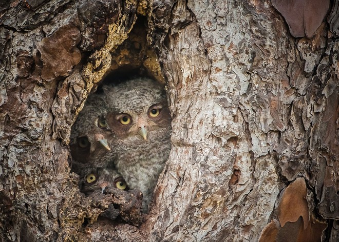 | Những con cú ẩn mình trong thân cây ở đầm lầy Okefenokee, Georgia, Mỹ. Ảnh: National Geographic |