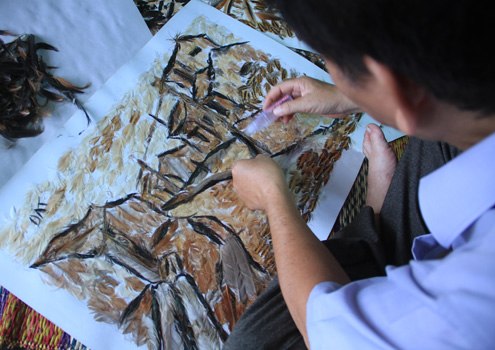 Để hoàn thành một bức tranh lông gà đẹp mắt, nghệ sĩ phải mất đến tận 4, 5 ngày để hoàn thành 4 công đoạn: tìm nguyên liệu, phác thảo tranh, chọn lông gà phù hợp hình dáng, màu sắc và tạo hình.