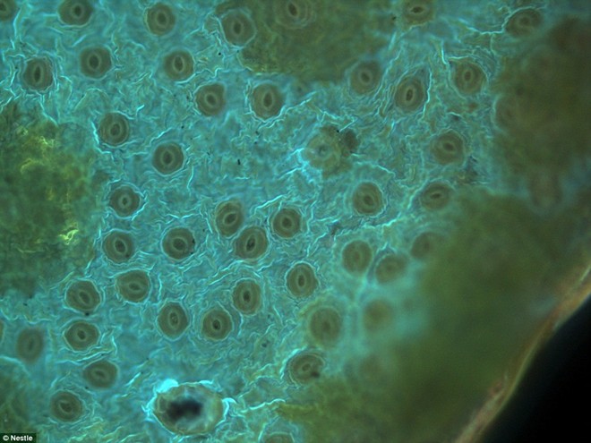 Cận cảnh lá trà xanh dưới ống kính phóng đại. Các vòng tròn là những lỗ khí trên bề mặt lá, giúp chúng trao đổi khí để phục vụ quá trình quang hợp.