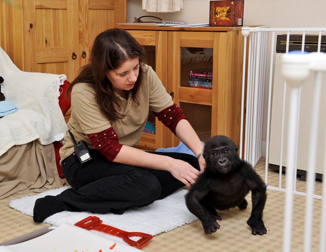 Làm mẹ thay thế của động vật: Trong ảnh là cô Sarah Chapman đang cho một con tinh tinh 6 tháng tuổi ăn. Do con tinh tinh này bị suy dinh dưỡng, cơ thể gầy yếu, nên Chapman trở thành mẹ thay thế của vườn thú, giúp đỡ cho ăn và chăm sóc con tinh tinh non. |