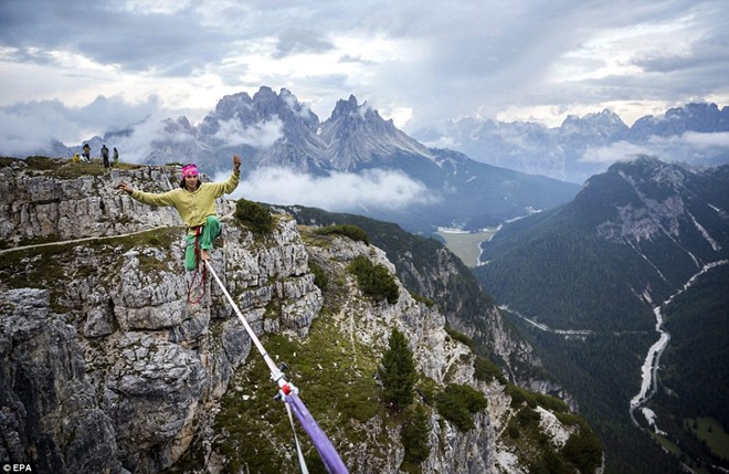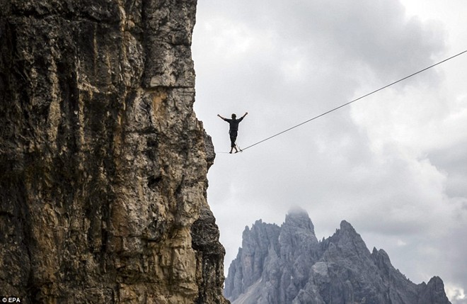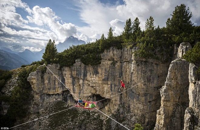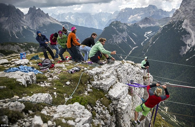 | Những nghệ sĩ trong ảnh là thành viên của của một nhóm các vận động viên ưa mạo hiểm, những người ngao du tới Monte Piana, Italy để tham gia Hội nghị trên dây quốc tế. Họ tập trung tại đây khoảng một tuần để có thể luyện tập môn thể thao mạo hiểm và hòa mình vào thiên nhiên. |