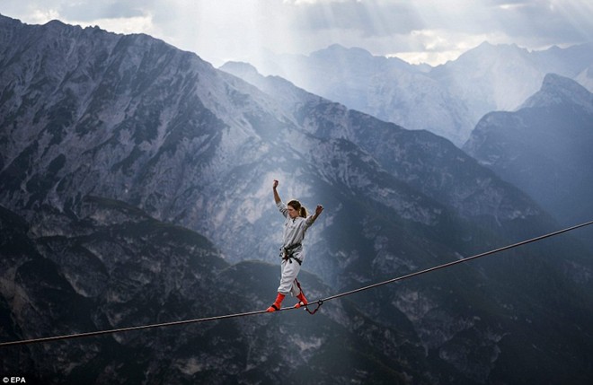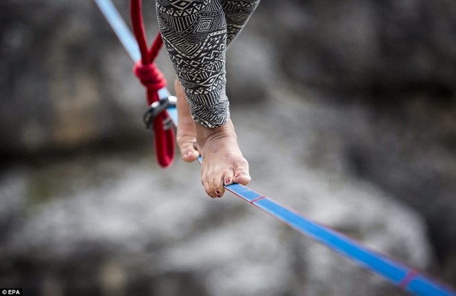 | Nữ vận động viên trổ tài đi trên một sợi dây ở độ cao hàng nghìn mét. |