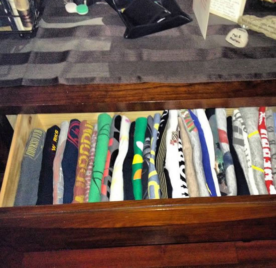 Khi gập quần áo bạn nên dựng đứng chúng, sẽ tiết kiệm được nhiều không gian hơn đấy. |