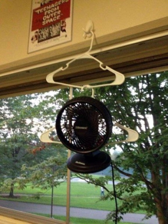 Và chúng ta đã có chiếc quạt treo tường cùng sự hỗ trọ của 2 chiếc móc áo.