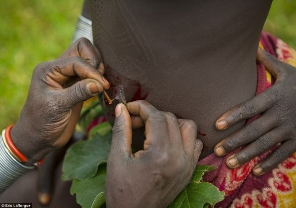 Để tạo ra những đường vân trên cơ thể, họ dùng gai chọc vào da và dùng dao lam cắt phần da đó. Sau khi vết thương lành sẽ tạo ra phần sẹo lồi như hình vẽ phác họa trước đó.