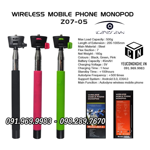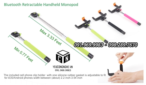 Đây là một phụ kiện không thể thiếu cho những chuyến đi xa. Thiết kế đơn giản, có thể kéo chiều dài lên đến 1m, bạn thoải mái chụp ảnh “tự sướng” cùng bạn bè. Sản phẩm không dây kèm nút bấm trên thân gậy giúp bạn di chuyển và sử dụng tiện lợi. Que chụp ảnh này tương thích với hầu hết các loại máy ảnh. Hãy liên hệ với icamera.vn để đặt hàng ngay từ hôm nay.