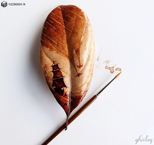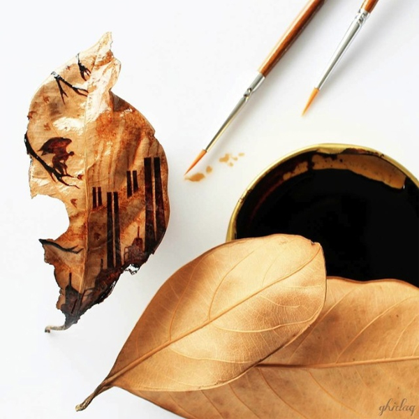 Bằng trí tưởng tượng và tâm hồn nghệ sỹ, Al-Nizar sử dụng những giọt cà phê còn sót lại trong tách, vẽ trên nền lá khô để tạo nên những cảnh sắc thiên nhiên thật sống động.