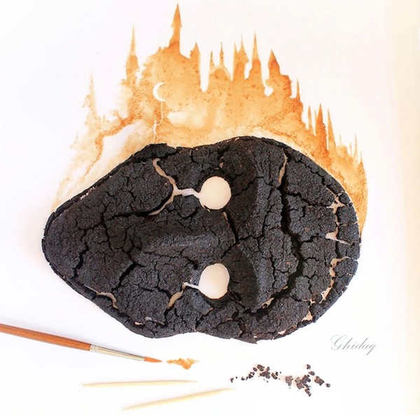 Al-Nizar dùng cọ để tạo đường nét và những vết cà phê tự nhiên.