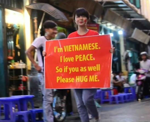 Bên cạnh những tấm biển ích kỷ hay khoe khoang, ở Hà Nội cũng từng xuất hiện một tấm biển khiến nhiều người ấm lòng . Cuối tháng 5/2014, một clip có tựa đề “Việt Nam yêu hòa bình” gây xôn xao cộng đồng. Tâm điểm là cô gái xinh đẹp cầm tấm biển màu đỏ với dòng chữ: Tôi là người Việt Nam. Tôi yêu hoà bình. Nếu bạn cũng thế, hãy ôm tôi” được viết bằng tiếng Anh.