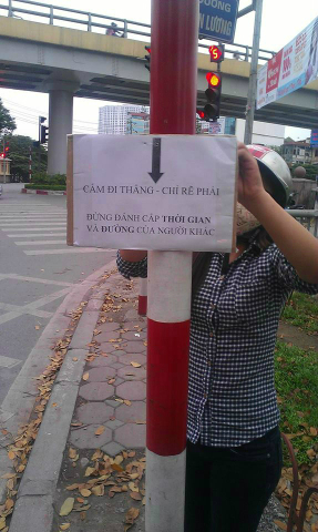 Hà Nội là nơi có nhiều biển báo do dân tự chế. Trong đó, biển báo xuất hiện tại ngã tư Láng Hạ với nội dung: "Cấm đi thẳng - chỉ rẽ phải. Đừng ăn cắp thời gian của người khác” là một tấm biển điển hình.