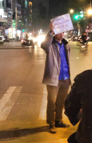 Thanh niên cầm biển cảnh báo cấm rẽ trái ngay giữa ngã tư.