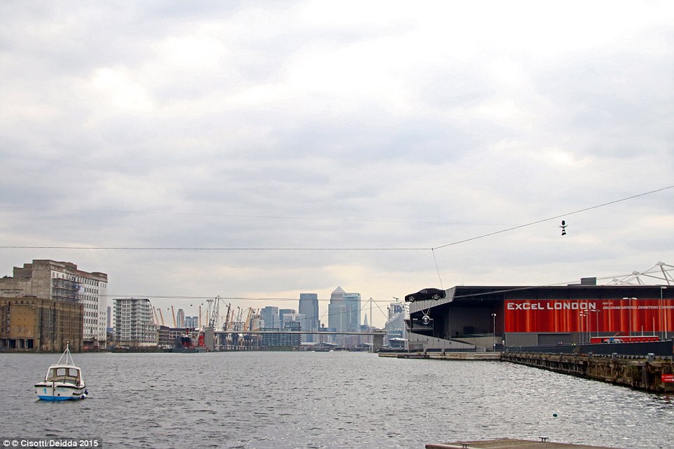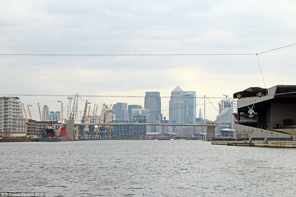 Chiếc xe Jaguar XF đang cố gắng băng qua sông Thames trên chiếc dây cáp với độ dày chỉ hơn 1 inch.