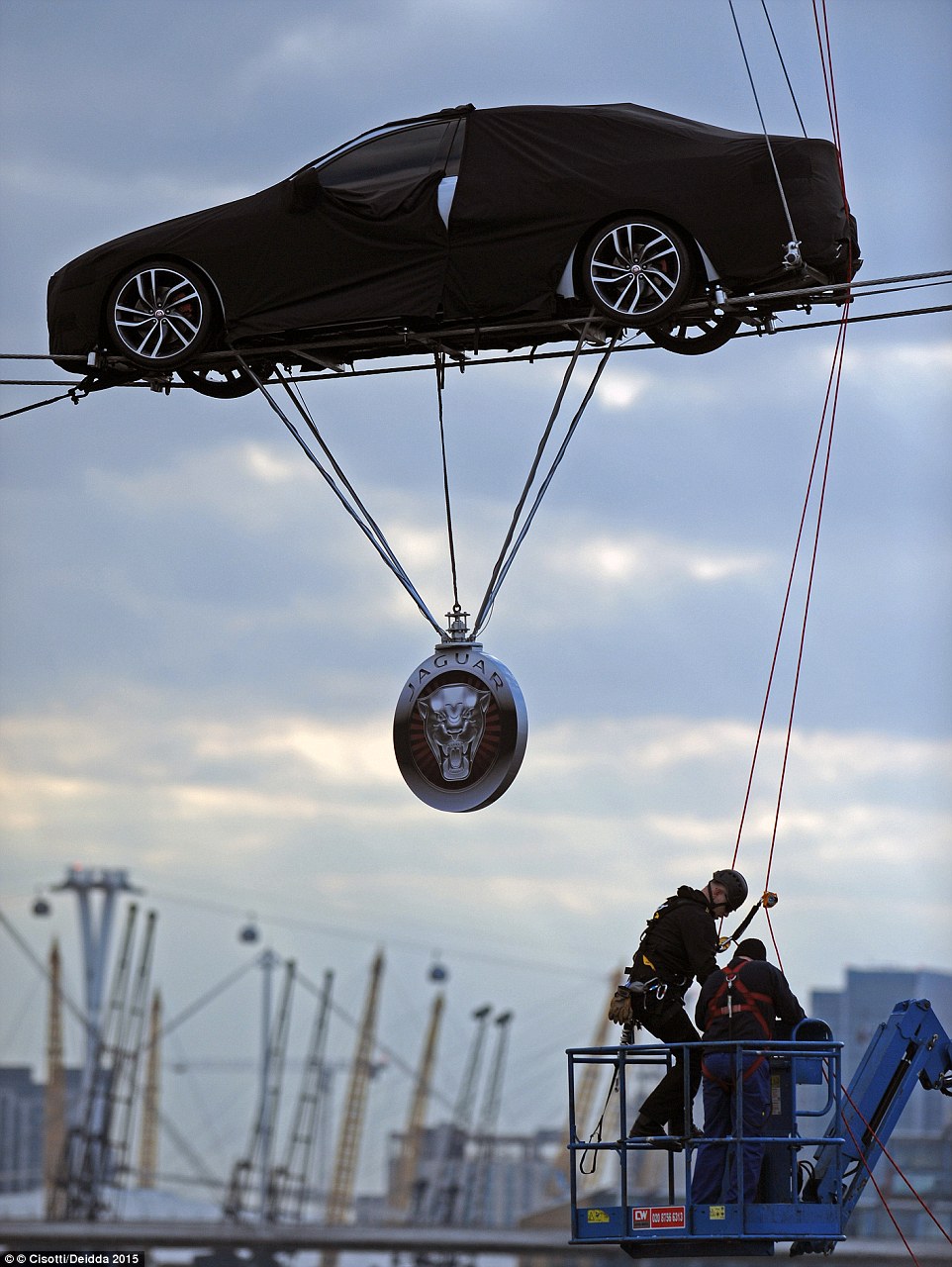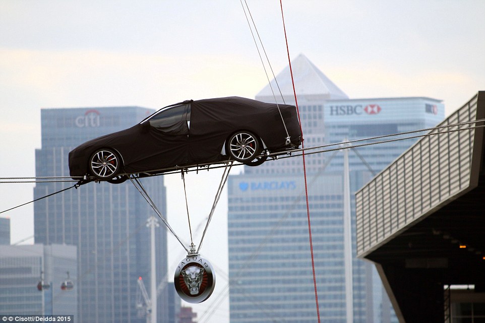 Chiếc xe Jaguar XF di chuyển một cách cẩn trọng dọc theo dây cáp.