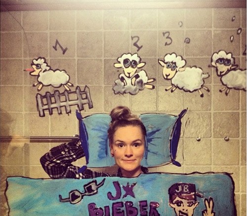 Mỗi bức ảnh của cô tốn khoảng 20-30 phút để sáng tạo. Cô sử dụng phấn hoặc bút dạ acrylic để vẽ trên gương phòng tắm của mình.