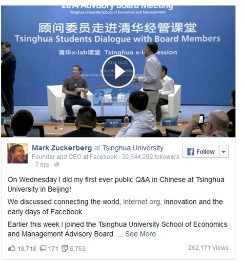 Tham gia buổi thảo luận hỏi đáp kéo dài 30 phút tại Đại học Thanh Hoa ở Bắc Kinh vào ngày 22/10, ông chủ Facebook Mark Zuckerberg đã nói chuyện hoàn toàn bằng tiếng Trung. Thậm chí anh còn biết pha trò bằng tiếng bản xứ, khuấy động không khí cả hội trường.