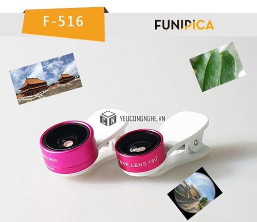 Funipica F-516 là loại ống kính đa năng với 3 loại ống kính khác nhau. Bao gồm: Ống kính Fisheye 180 độ, ống kính Macro 15x và ống kính góc rộng 0.36x.