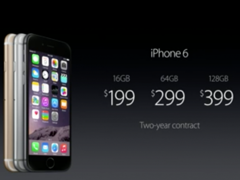 iPhone 6 có giá 199 USD (kèm hợp đồng 2 năm) cho bản 16GB, rẻ hơn 100 USD so với iPhone 6 Plus giá khởi điểm 299 USD cùng bộ nhớ. Tương tự, iPhone 6 giá 299 USD cho bản 64GB, 399 USD bản 128GB.