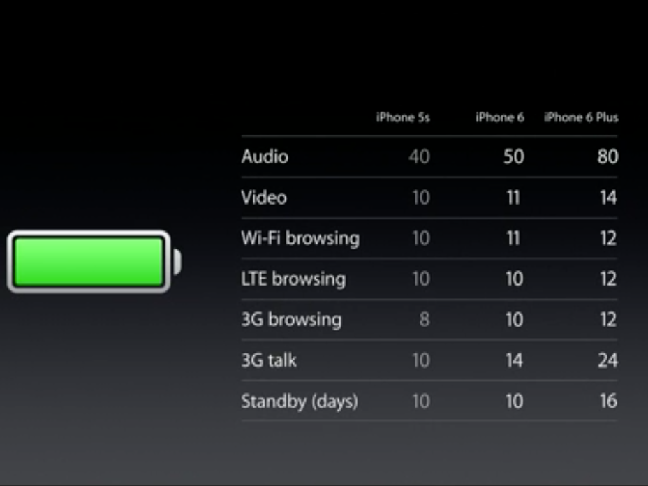 iPhone 5s và iPhone 6 có pin trụ được khoảng 10 tiếng, trong khi đó iPhone 6 Plus lại có thời gian sử dụng 16 tiếng.