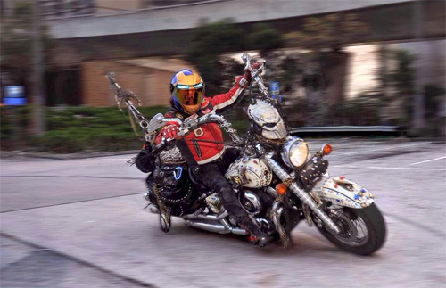 Điều khiển chiếc môtô độ kỳ quái là nhân vật bí ẩn trong trang phục của Quái vật vô hình.