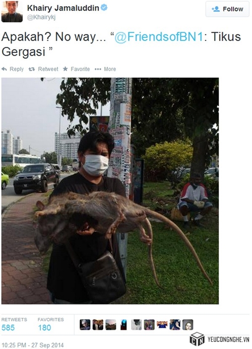 Được chia sẻ trên tài khoản Twitter cá nhân chính thức của ông Khairy Jamaluddin, Bộ trưởng Bộ Thanh niên và Thể thao Malaysia ngày 27/9 vừa qua, hình ảnh một người đàn ông bên trên tay 2 con chuột khổng lồ đã trở thành đề tài bàn luận sôi nổi của cộng đồng mạng quốc gia này.
