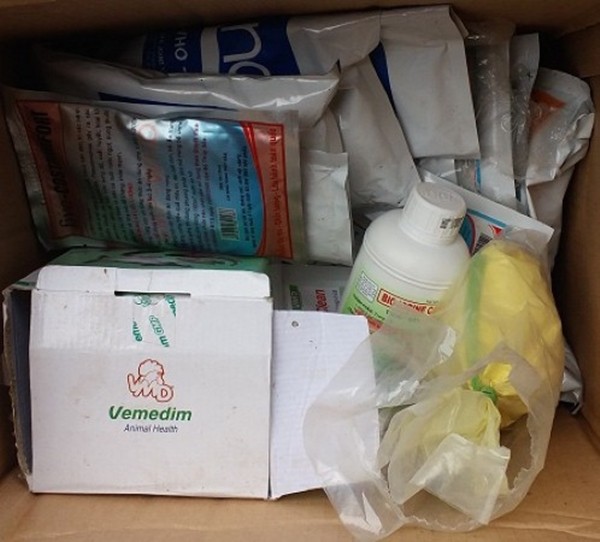 Thuốc được pha, tạt vào nước trước hoặc sau khi thay bể, hoặc trộn vào thức ăn cho lươn như thuốc tiêu hóa. Anh Trung bê ra một thùng carton lớn trong đó có nhiều loại thuốc sát trùng, kháng sinh ghi bằng tiếng Việt.
