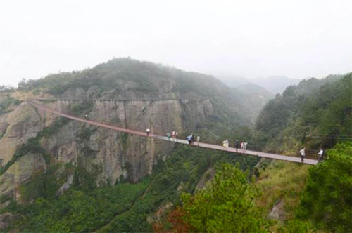 Cây cầu trải dài hơn 300m bắc qua hai ngọn núi với phần lối đi được thay thế bằng kính chịu lực nhưng khi gió thổi chúng vẫn có thể lung lay.