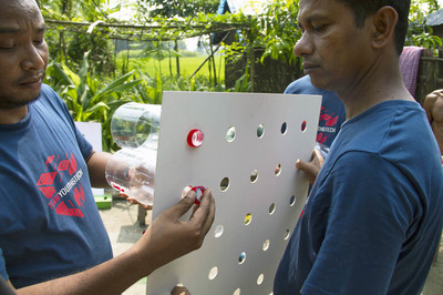 Tình nguyện viên đang “lắp đặt” điều hòa không cần điện năng cho các hộ dân Bangladesh.