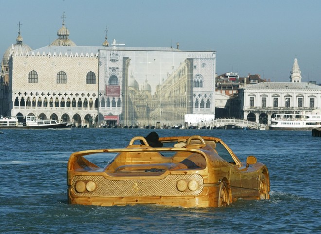 Livio De Marchi mất 5 tháng để đẽo gọt khối gỗ thông thành một con thuyền có hình thù giống xe thể thao Ferrari F50. Ông gắn thêm động cơ cho thuyền, biến nó thành phương tiện độc nhất vô nhị.