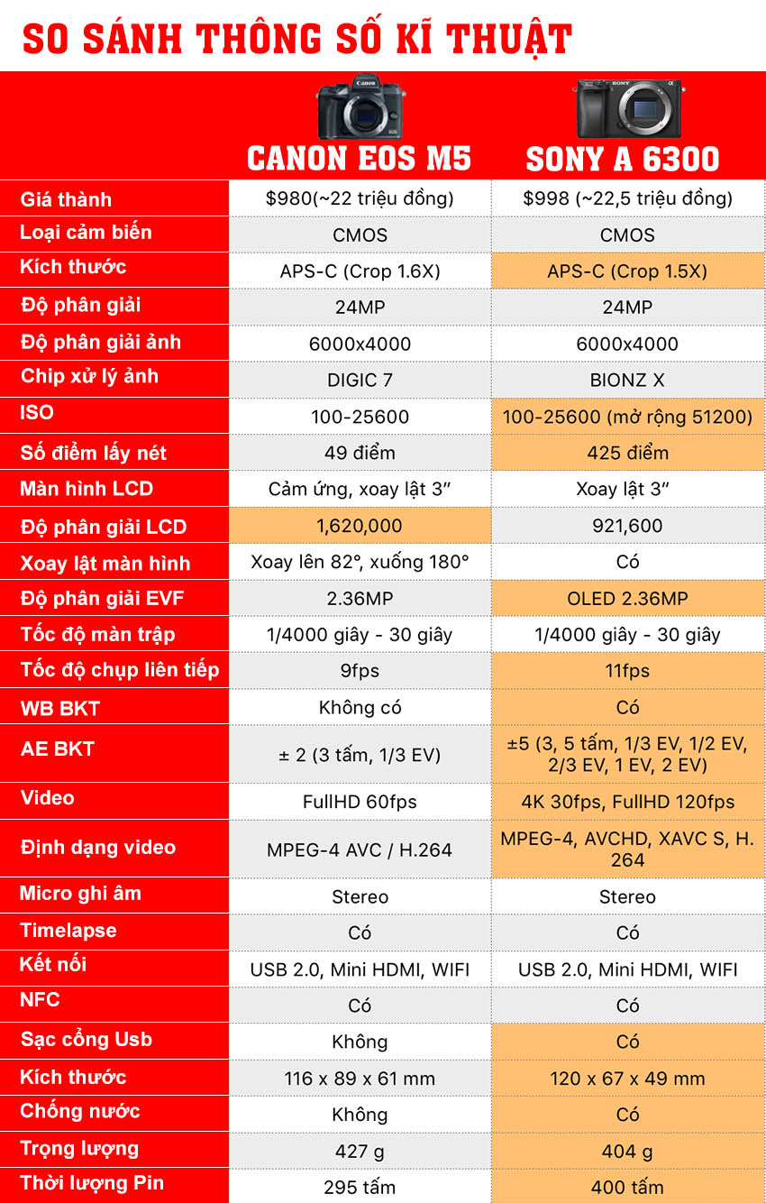 Sau đây, chúng ta sẽ so sánh thông số kỹ thuật của hai dòng máy Mirrorless đang được ưa chuộng trên thị trường là Canon EOS M5 và Sony A6300. Mặc dù hai chiếc máy này có giá hơi chênh nhau nhưng nếu xét về mọi thứ từ các tính năng, công nghệ về hình ảnh, giá trị và độ phổ thông thì đây là hai chiếc gần như tương đương nhau.