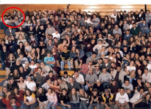 Thoạt nhìn thì đây chỉ là một bức ảnh tốt nghiệp trung học rất vui vẻ. Nhưng nếu bạn nhìn thật kỹ vào góc trên ngoài cùng bên trái sẽ thấy hai học sinh giơ tay tạo dáng hình súng nhắm vào máy ảnh.