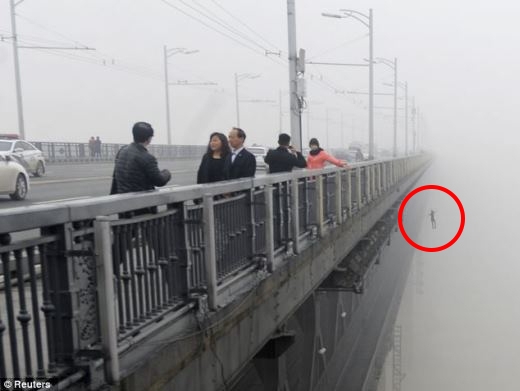 Đây có thể là một bức ảnh chụp đường phố vô cùng bình thường. Tuy nhiên, khi nhìn vào rìa phải của bức ảnh, bạn sẽ thấy một bóng người lao mình từ cây cầu xuống dưới. Một nhiếp ảnh gia người Trung Quốc đã vô tình chụp lại được hình ảnh một người tự tử vào năm 2013.